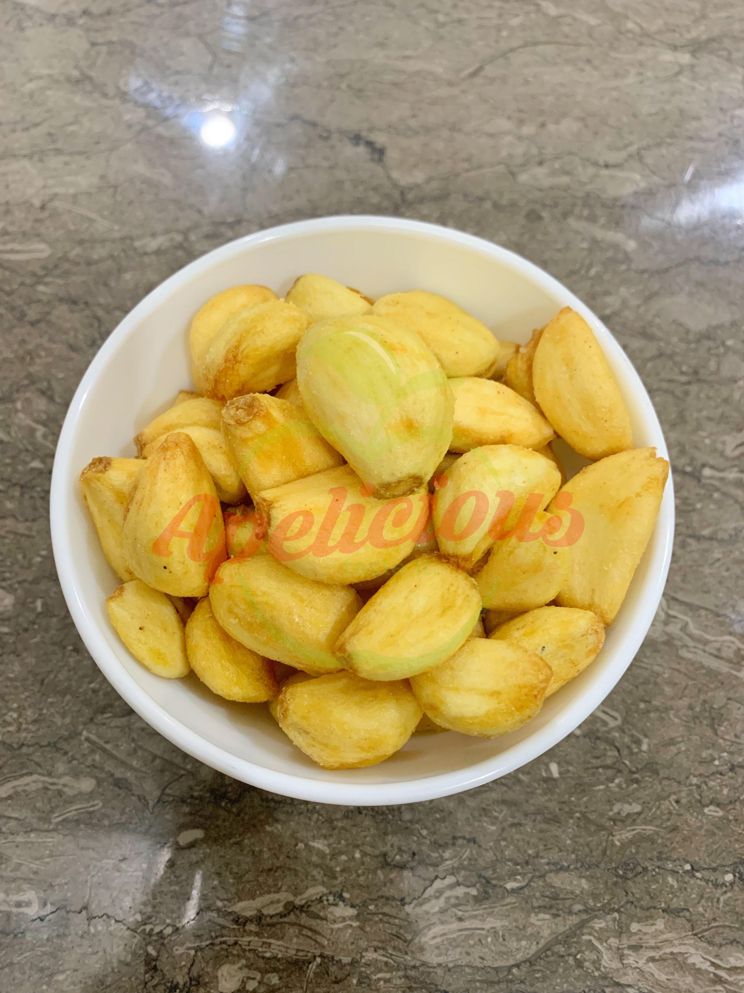 Keripik Bawang Putih diolah menggunakan mesin vacum frying yang mempunyai tekstur garing renyah dan memilki rasa gurih sedikit asin (ada tambah sedikit garam) terbuat dari 100% bawang putih.